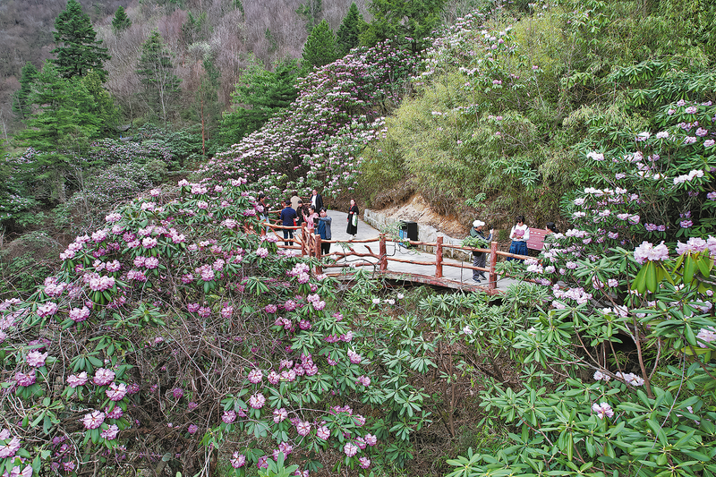 近日,鎮安縣木王國家森林公園的杜鵑花相繼盛開,吸引不少游客前來踏青賞花。據了解,木王國家森林公園擁有西北連片面積最大的杜鵑林帶,分布面積千余畝,品種達12種之多,素有“千山杜鵑”之美譽,花期從3月中旬開始,一直持續到4月中下旬。 (本報記者 李小龍 攝)