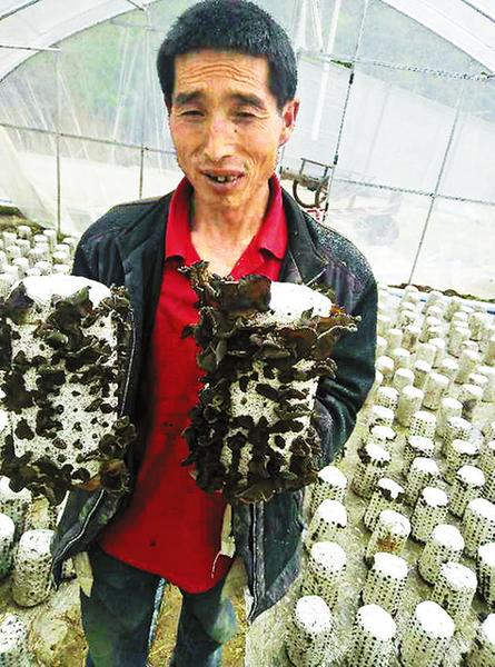 在中坪基地確定貧困戶借耳時,殘疾人貧困戶朱立印提出了申請。村干部看到他一只腳殘疾,行動不便,年齡已有65歲,妻子也是聾啞人,建議他不參加這個項目,老人家卻說:“我還能動,我不能拖大家后腿,等著國家給我兜底扶貧。”大家都被他這種不等不靠的精神所感動,基地其他貧困戶都來給他幫忙刺孔、掛袋,前期任務順利完成。經過20多天的細心管理,看到拱出的耳花和長大的木耳,朱立印輕撫著菌袋激動地向村干部和技術員說:“我們農村人養兒防老,指望兒子。這木耳就是我兒子啊,有了木耳,脫貧就有了指望。”
