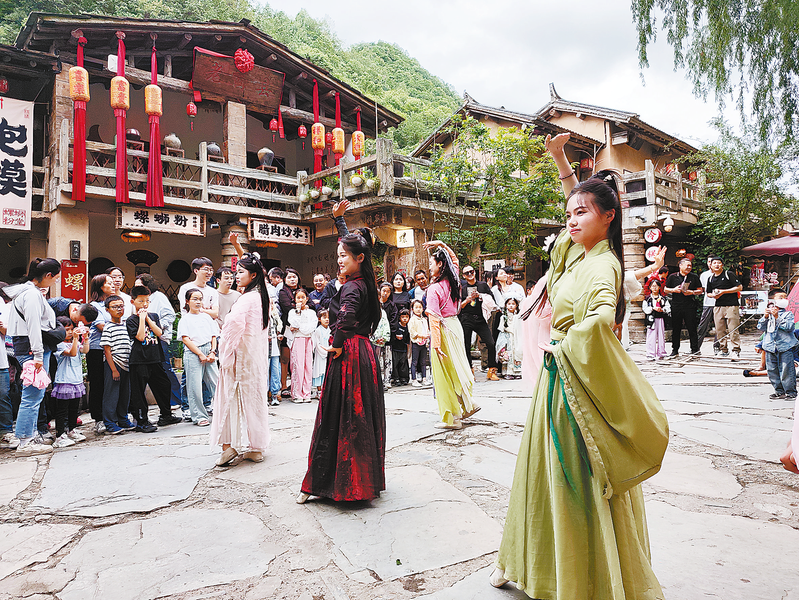 端午假期,柞水縣終南山寨景區推出系列特色文旅活動,吸引眾多省內外游客慕名而來。圖為景區精心策劃的NPC游園活動,沉浸式互動體驗令游客紛紛駐足,拍照打卡,現場熱鬧非凡。